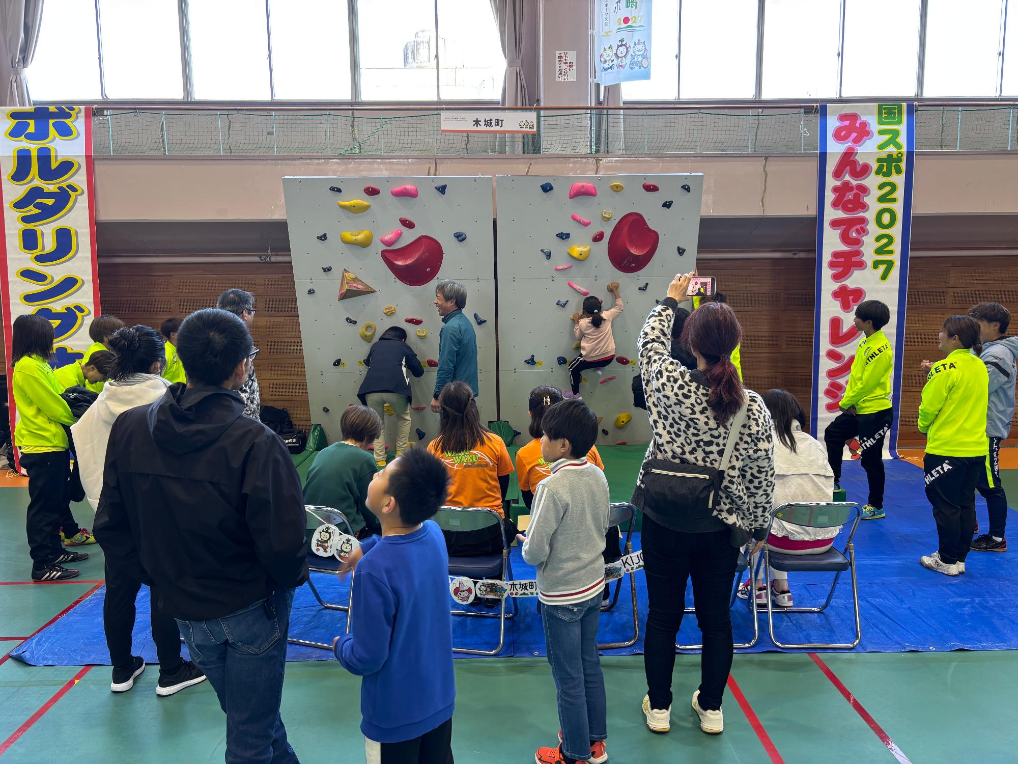 両町で開催される国スポ競技を自由に体験できる中、木城町ではボルダリングの体験会を実施しました!子どもから大人の方まで約100人の方に体験していただき、大盛り上がりの会場となりました♪