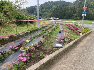 県道木城高鍋線のゴミ拾いや除草作業、花木管理、花苗等の植栽さらには、中川原ポケットパークの清掃と季節ごとの花の植栽を行う。
